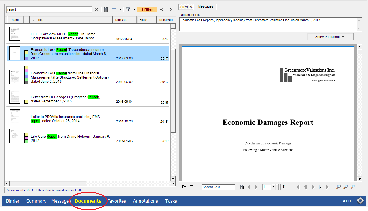 As the name suggests, quick filters offer a speedy way to filter your Case documents to a smaller subset containing the filtered term in the title and any profile fields displayed in your Document List View. The example above shows the result of a quick filter on the word “report.”