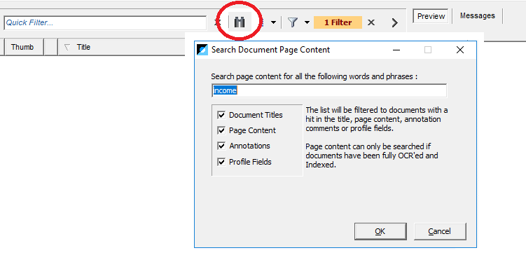 You can search your Case document contents, including text, titles annotations and profile fields by clicking the binocular icon at the top of the search screen. This opens the Search Document Page Content window. Use the checkboxes to select types of content to be searched. Enter your search query in the search box. This field allows you to enter specific phrases in quotations, or perform a truncated search using the asterisk (*) key to more flexibly include content with varied syntax.