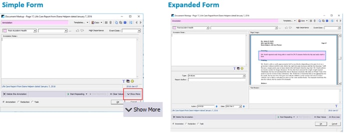 Primafact 6 Annotation Forms support uniform visual coding, along with dedicated fields to support quick assembly of Chronologies, Discovery Outlines and other reports. The annotation form can be expanded to capture more information. Clicking the Show More / Show Less button at the bottom-right corner of the Annotation form will expand or limit the display.