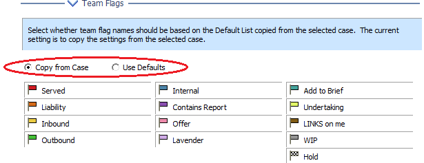 Notice that the Copy from Case button is selected on every section. If you prefer to use Primafact Global Defaults for this section, click the Use Defaults button. - Repeat step (e.) for every section that you wish to change from the Copy from Case setting.