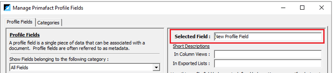 - The Manage Primafact Profile Fields window will split into two panels. A New Profile Field is automatically created. Rename the field in the Selected Field box. This will be the Field's name in Primafact.