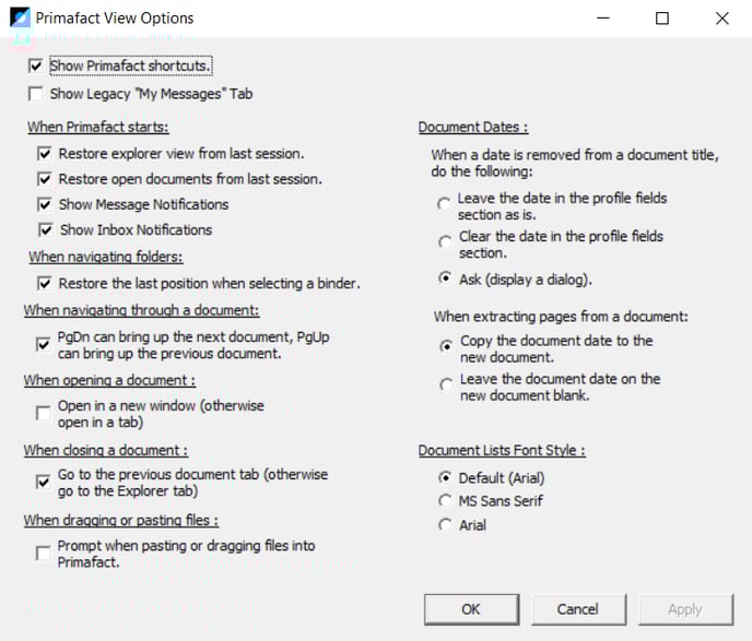 You can customize a number of personal viewing preferences for Primafact. Customizable preferences include overall Preferences, Binder View settings, and List View settings for Primafact Inboxes and other Primafact Lists.